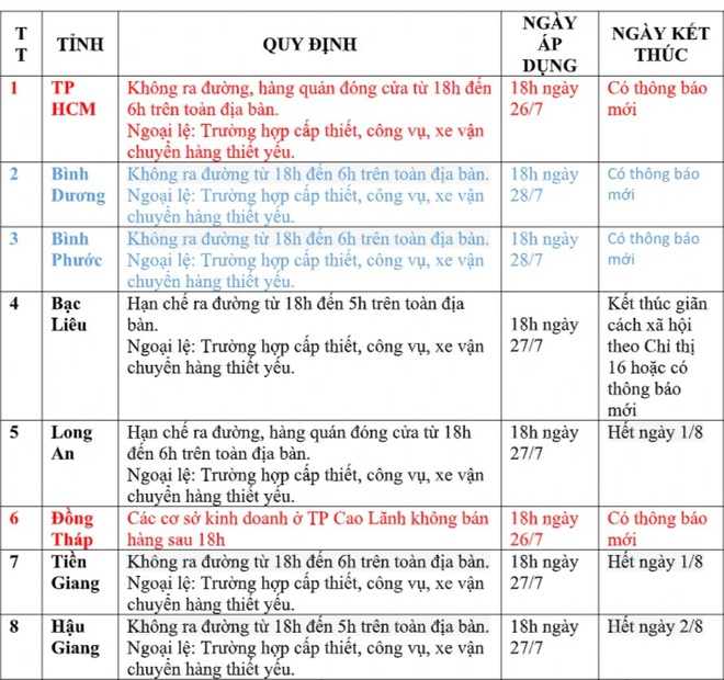 Ngày 27/7, UBND Bình Dương, Bình Phước, Bến Tre đã có thông báo yêu cầu người dân trên địa bàn tỉnh không được ra đường từ 18h ngày hôm trước đến 6h ngày hôm sau, trừ những trường hợp cần thiết. Các cửa hàng, cơ sở kinh doanh phải đóng cửa, ngưng hoạt động trong khung thời gian này.