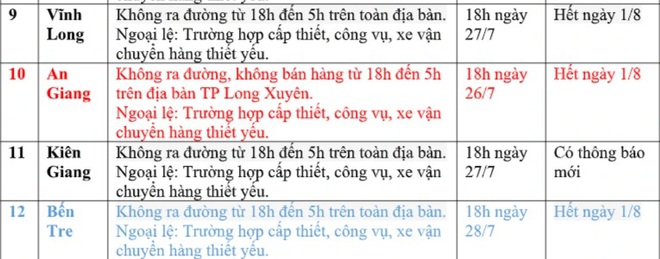 Ngày 25-26/7, một số tỉnh, thành của ĐBSCL như Long An, Tiền Giang, Bạc Liêu, Vĩnh Long, Kiên Giang, Hậu Giang, TP Long Xuyên (An Giang), TP Cao Lãnh (Đồng Tháp) cũng đã ban hành quy định yêu cầu người dân trên địa bàn toàn tỉnh không ra đường từ 18h ngày hôm trước đến 5h ngày hôm sau.