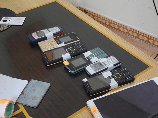 Tiến hành khám xét các địa điểm do Thêm và Vinh làm chủ, lực lượng chức năng thu giữ nhiều thiết bị điện tử, hàng chục điện thoại di động, máy in vận đơn, máy khò nhiệt, máy ép nhiệt, thẻ bảo hành giả, hơn 100 điện thoại di động chất lượng kém phục vụ hoạt động phạm tội.