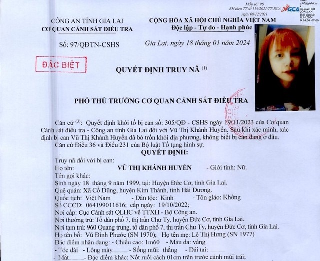Cơ quan CSĐT Công an tỉnh Gia Lai truy nã đặc biệt Vũ Thị Khánh Huyền về hành vi “mua bán người”.