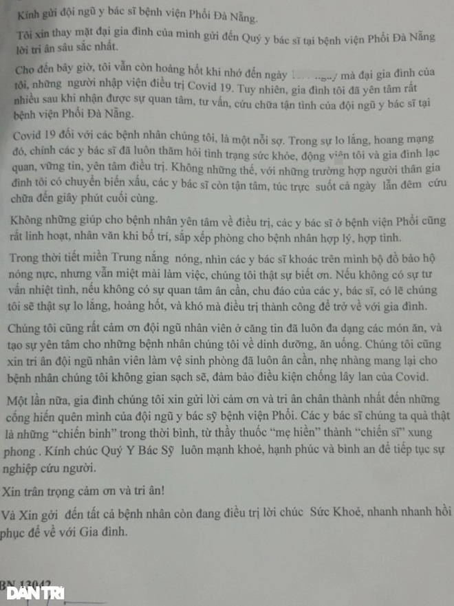 Ngày ra viện, anh H. viết thư cảm ơn các y, bác sĩ Bệnh viện Phổi Đà Nẵng đã chăm sóc, điều trị cho gia đình anh những ngày qua.