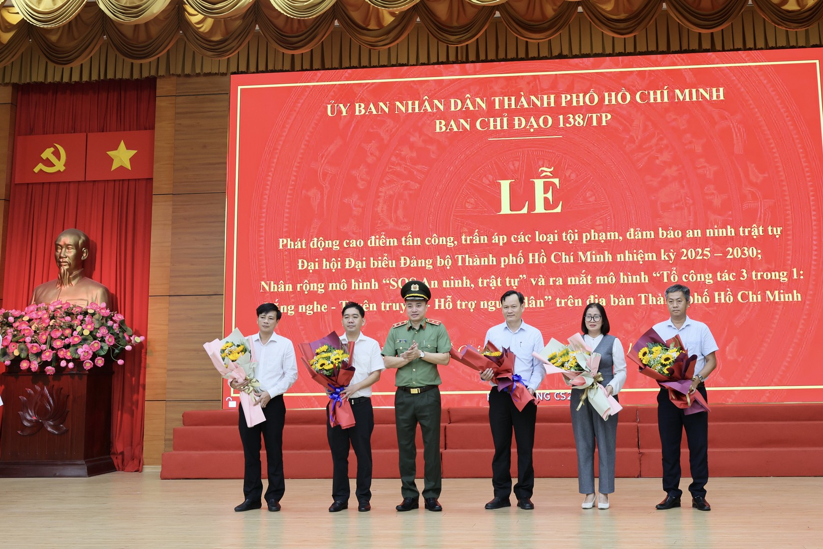 Sáng 01/10/2025, Công an Thành phố (CATP) Hồ Chí Minh tổ chức Lễ phát động cao điểm tấn công, trấn áp các loại tội phạm, bảo đảm an ninh, trật tự Đại hội đại biểu Đảng bộ TP Hồ Chí Minh lần I, nhiệm kỳ 2025-2030; tổ chức nhân rộng mô hình “SOS An ninh, trật tự” và ra mắt mô hình “Tổ công tác 3 trong 1: Lắng nghe – Tuyên truyền – Hỗ trợ người dân” trên địa bàn TP. Trung tướng Mai Hoàng, Giám đốc CATP, Phó Trưởng Ban thường trực Ban Chỉ đạo 138 TP chủ trì buổi Lễ.