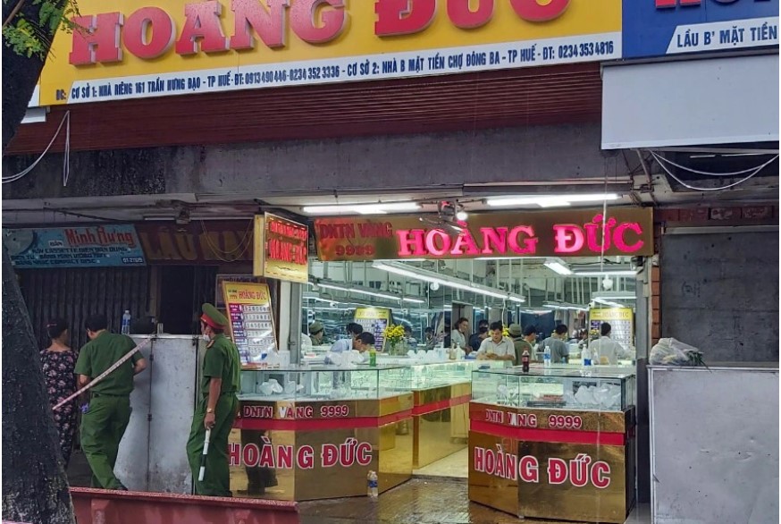 Lúc 13h cùng ngày, Ngô Văn Quốc (38 tuổi, công tác tại Trại giam Bình Điền) đi xe máy hiệu Future đến khu vực chợ Đông Ba, TP Huế. Cầm theo súng AK xông vào tiệm vàng Hoàng Đức, người này hét lớn: “Ngồi im, không sẽ lấy hết vàng”.