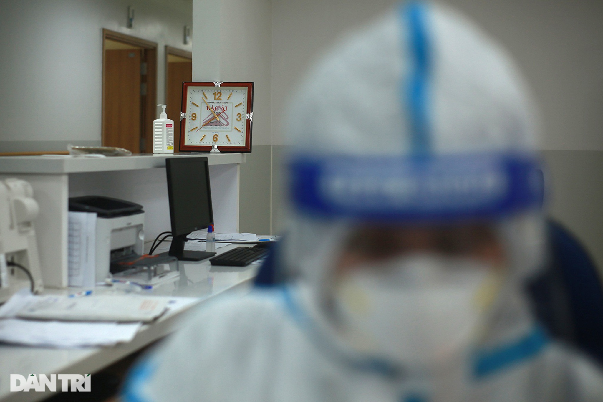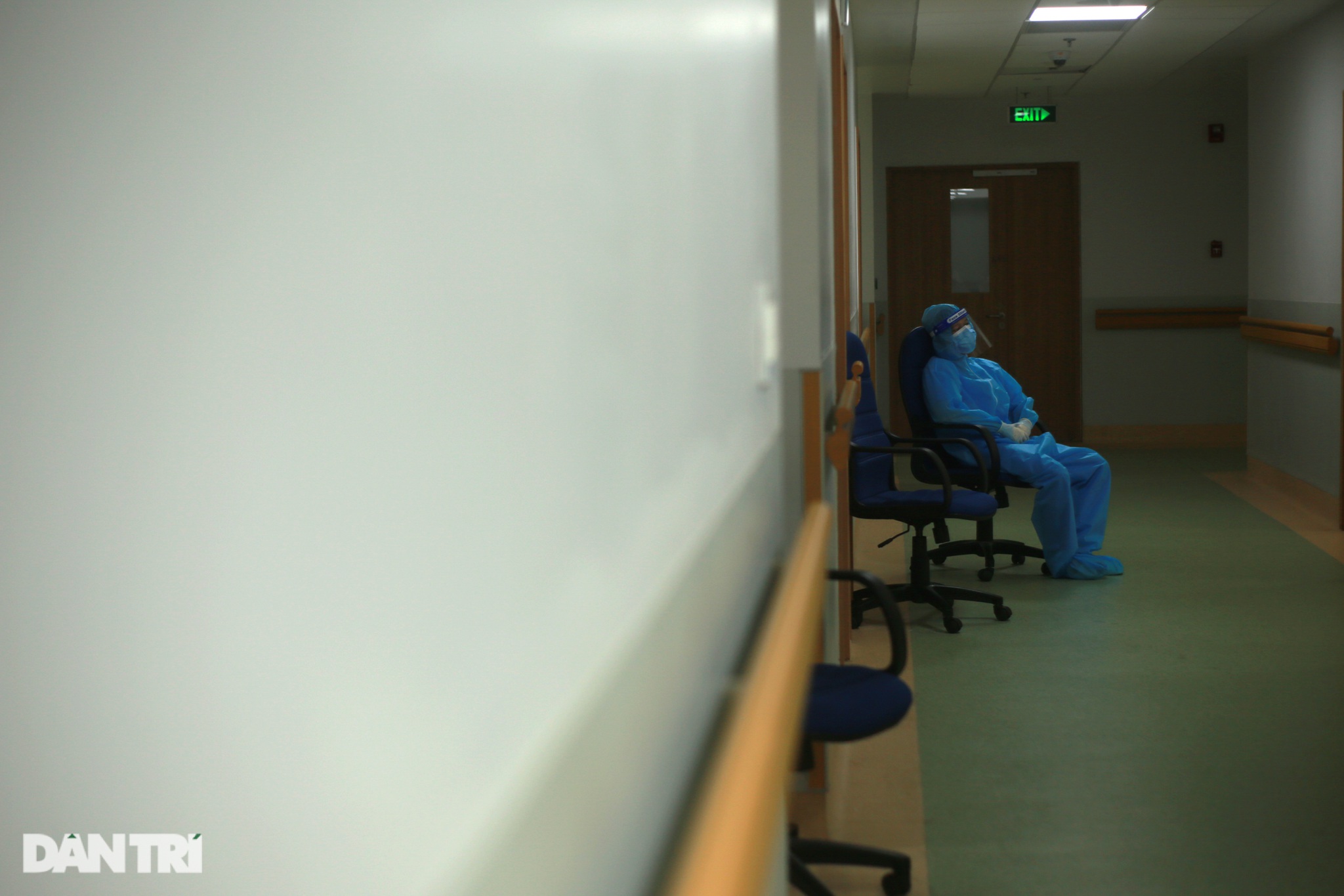 Một số nhân viên y tế khác thấm mệt sau nhiều giờ làm việc căng thẳng, dựa tạm vào tường để nghỉ ngơi trong chốc lát.