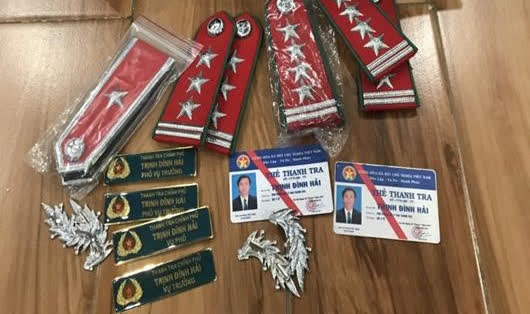 Hải khai nhận những trang phục như áo, nón phù hiệu, cầu vai, bảng tên và thẻ thanh tra Hải đặt mua trên mạng xã hội với giá 4 triệu đồng.
