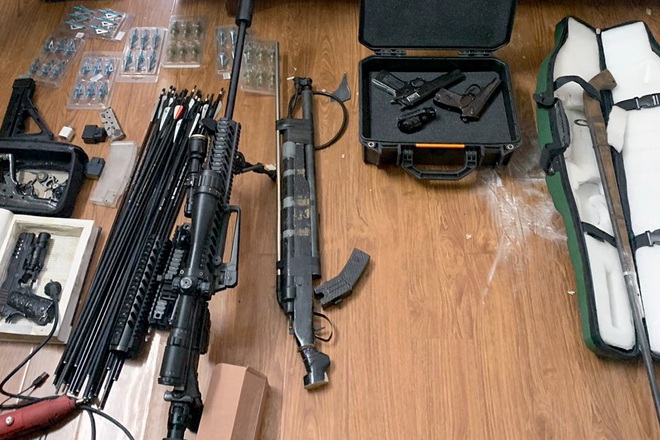 Khám xét nơi ở của Nguyễn Tiến Dũng tại phường Định Công (quận Hoàng Mai), cảnh sát thu giữ 7 khẩu súng quân dụng, một khẩu súng kíp, một khẩu súng hơi, 65 viên đạn, một cây cung, 6 mũi tên và một mô hình quả lựu đạn.