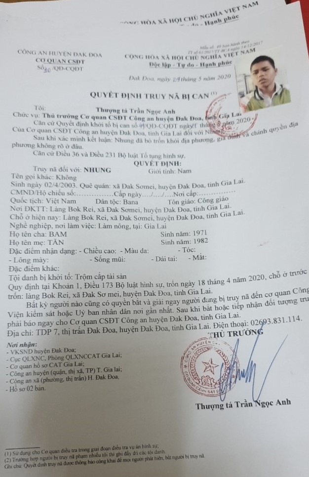 Qua kết quả xác minh, lực lượng công an xác định đối tượng tên Nhung (không có họ, SN 2003, trú tại huyện Đắk Đoa, tỉnh Gia Lai). Đối tượng Nhung đang bị truy nã theo quyết định truy nã số 10 ngày 29-5-2020 của Cơ quan CSĐT Công an huyện Đắk Đoa về tội trộm cắp tài sản.