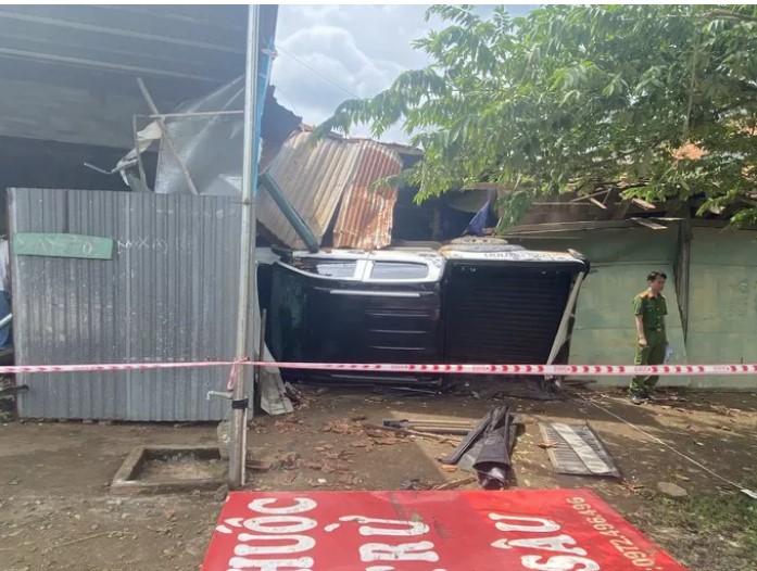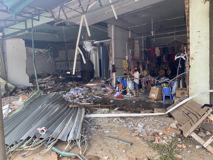 Tại hiện trường, 2 xe trên đã lao thẳng vào và làm hư hỏng nhiều tài sản của 4 căn nhà dân ven đường. Cửa kéo và tường nhà của một số hộ dân bị tông sập. Xe tải mang BKS: 81H00671 nằm gọn trong 1 nhà dân, xe bán tải mang BKS: 51D18339 lật ngang.