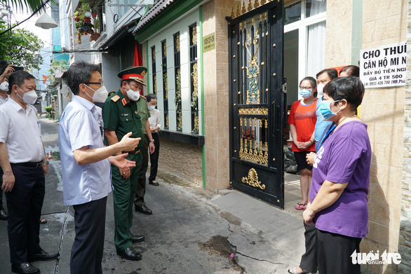 Đến thăm một số hộ gia đình có F0 đang điều trị tại nhà bên trong một số hẻm trên đường Tôn Thất Thuyết, Phó thủ tướng động viên bà con giữ tinh thần lạc quan, tăng cường dinh dưỡng, thường xuyên tập thể dục để mau khỏi bệnh.