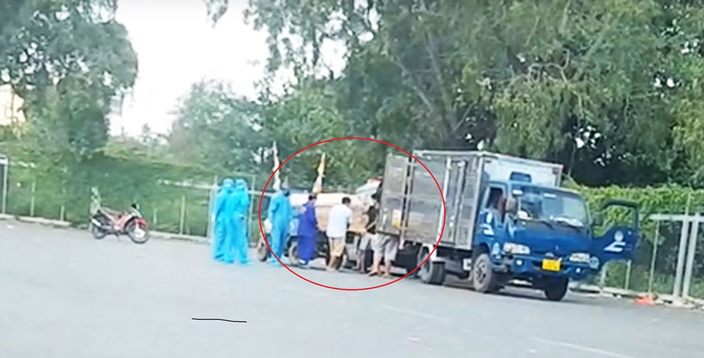Khoảng 15 giờ 30 ngày 7.8, theo ghi nhận của PV Thanh Niên, nhóm khoảng 8 người tập trung ngay khu vực đối diện cổng chính của Trung tâm hỏa táng (TTHT). Nhóm này đang ngồi ăn uống sau nhiều giờ khiêng quan tài “sang qua, sang lại”. Ngay sau đó, một chiếc xe ba gác chở quan tài xuất hiện thì nhóm thanh niên vội vàng đeo găng tay chuyển chiếc quan tài trên xe ba gác qua xe tải. Sau cuộc giao dịch chớp nhoáng, xe tải chạy vào lại TTHT.